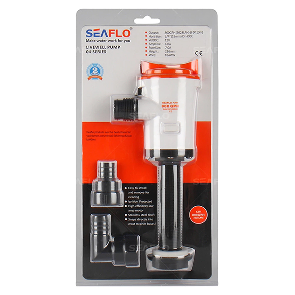 | Seaflo Vertical Livewell Pump 12V 800GPH | SFBP1-G800-04 | 800GPH | 12v | 3.5A | 19mm/3/4″ | 1m |
